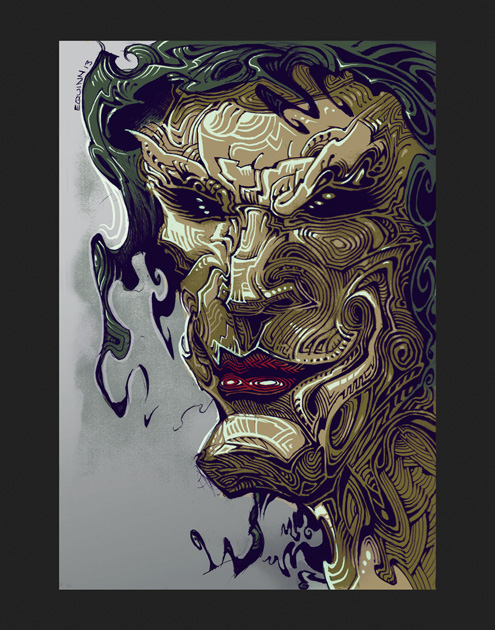 More psychedelic linework of one of my favorite characters. Done in ballpoint pen, I do like to alternate between crowquill + ink and a regular ballpoint in my work. Colored digitally. Giclee full-color print. 11" x 14" so will fit a standard frame size.