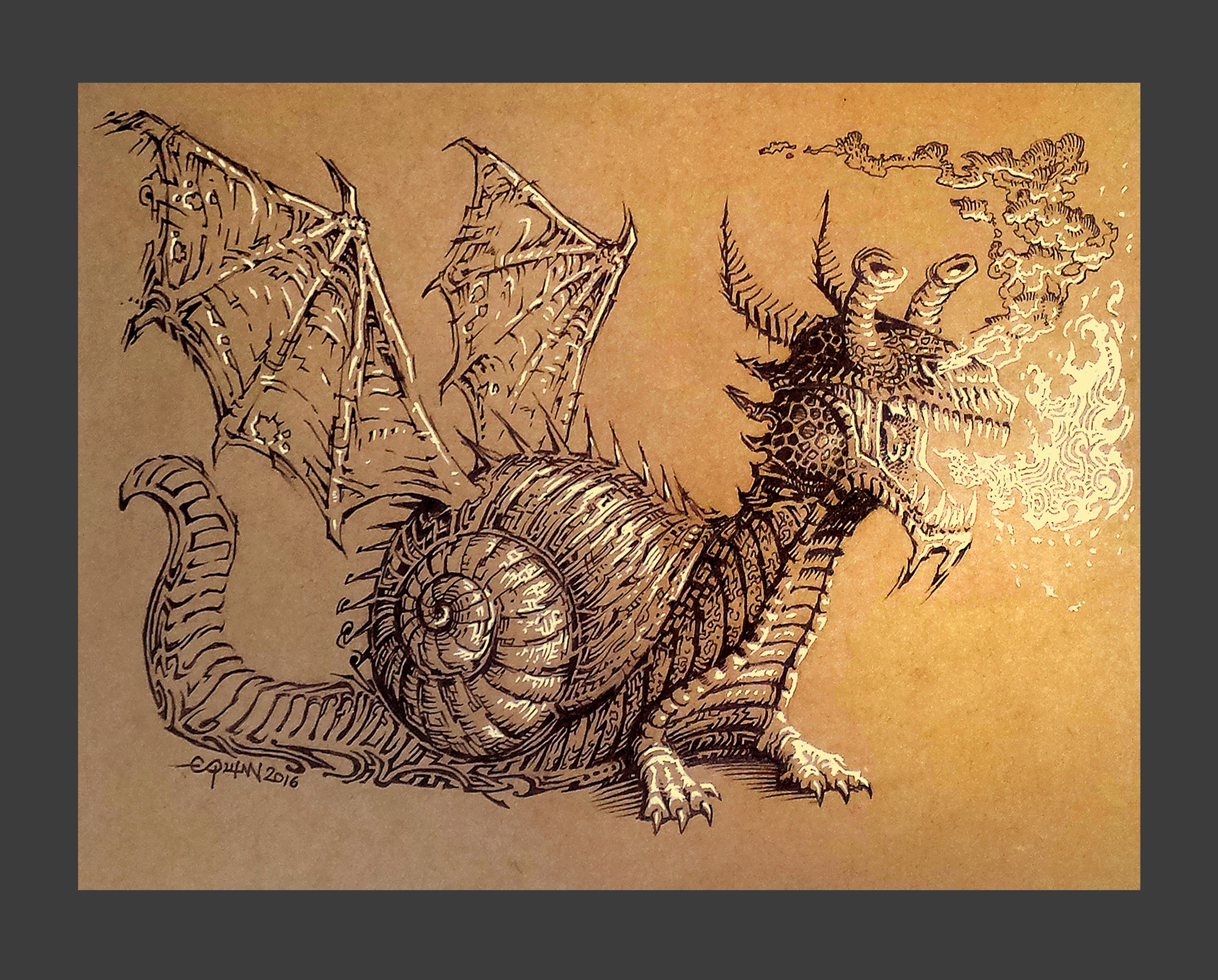 8"x10" Giclee print, suitable for framing! Pen and ink on toned paper with Sakura Gelly Roll for the highlights. Fun little snail dragon, hence the "snailgon!" Great gift for kids and adults alike!